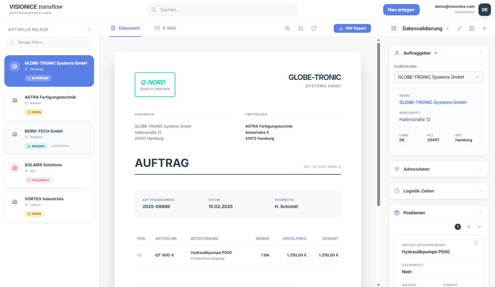 Mit der VISIONICE transflow ® Auftragserfassung automatisieren Sie die Verarbeitung Ihrer Speditionsaufträge nahezu vollständig. Schnell, präzise und zuverlässig. Unsere KI-gestützte Lösung liest eingehende Aufträge automatisch aus, extrahiert alle relevanten Daten, prüft diese intelligent und überträgt sie direkt in Ihr Transportmanagementsystem (TMS).